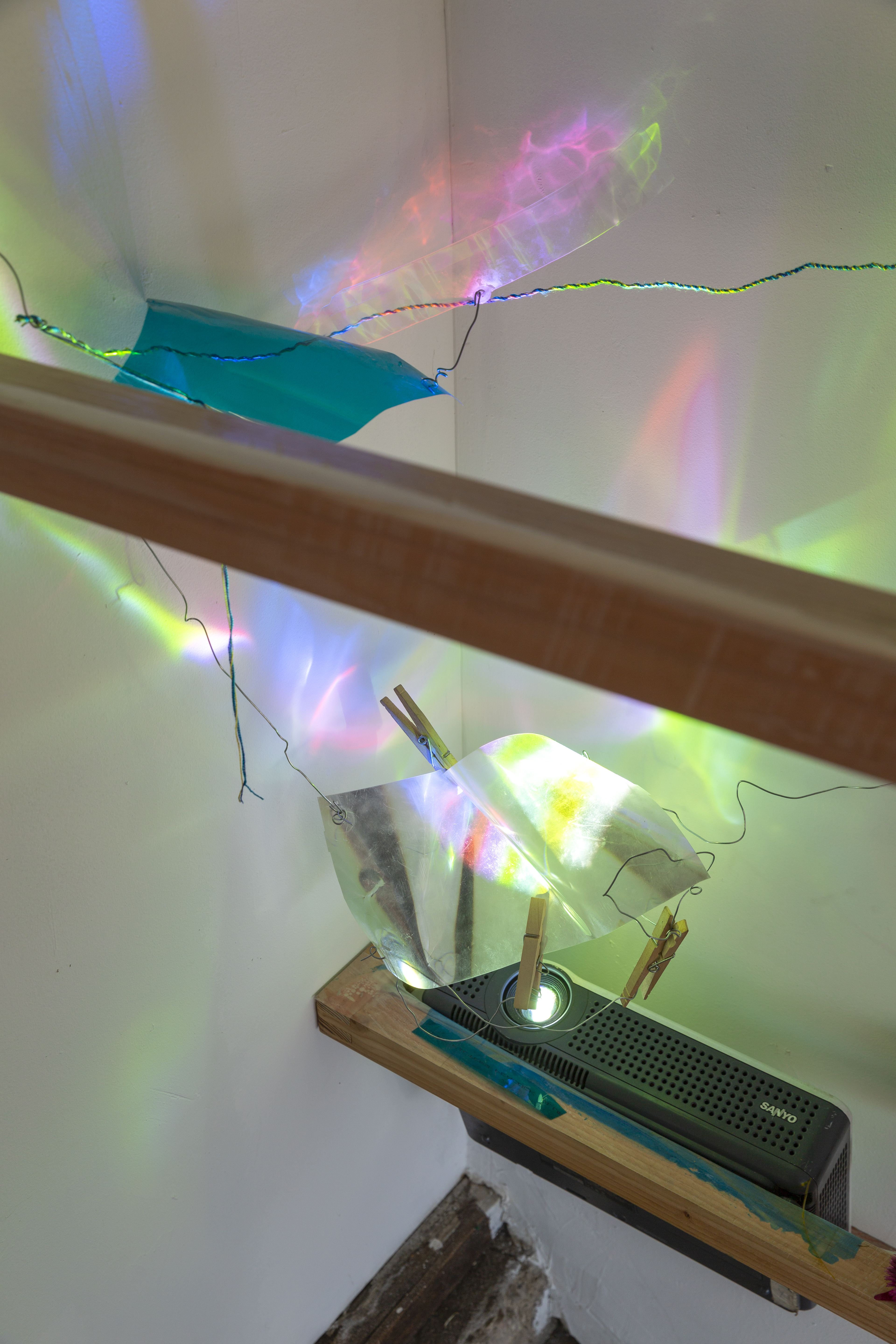 Screenprinting frames, projector, monitor, lenticular film, cine film, 35mm film, c47 clips, prayer candle glass, steel wire, string, dried birthday flowers, gleaned voice memos