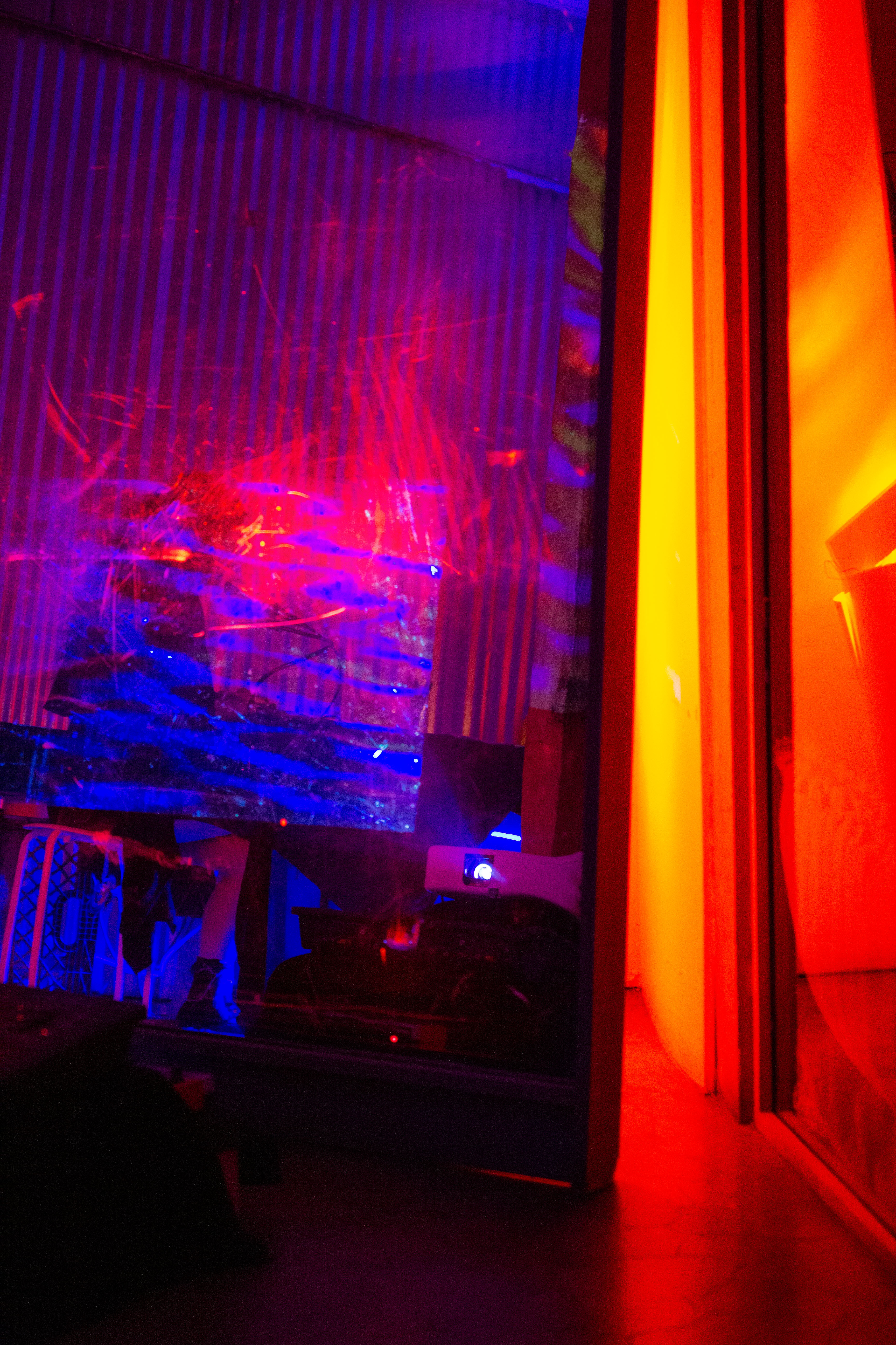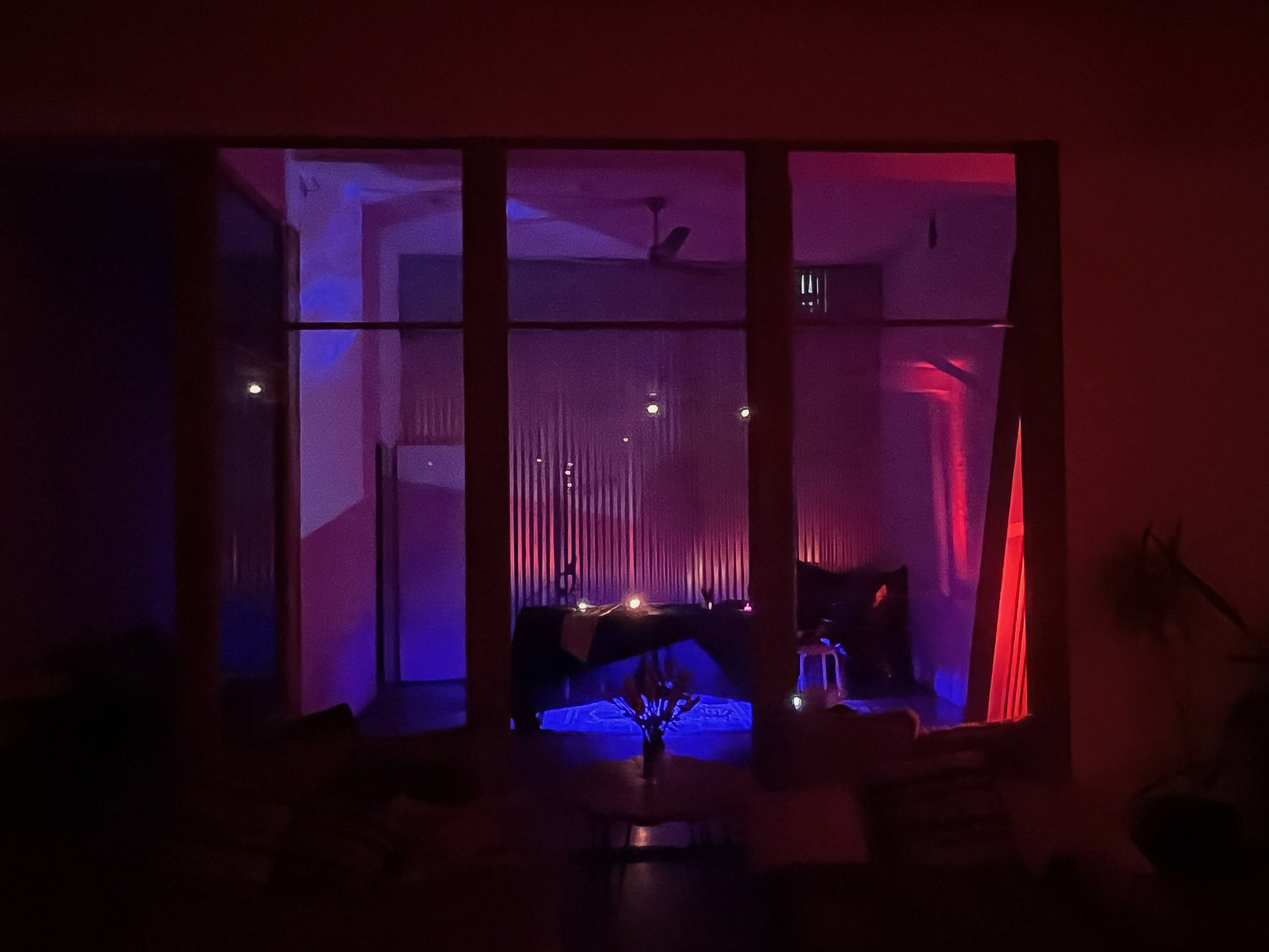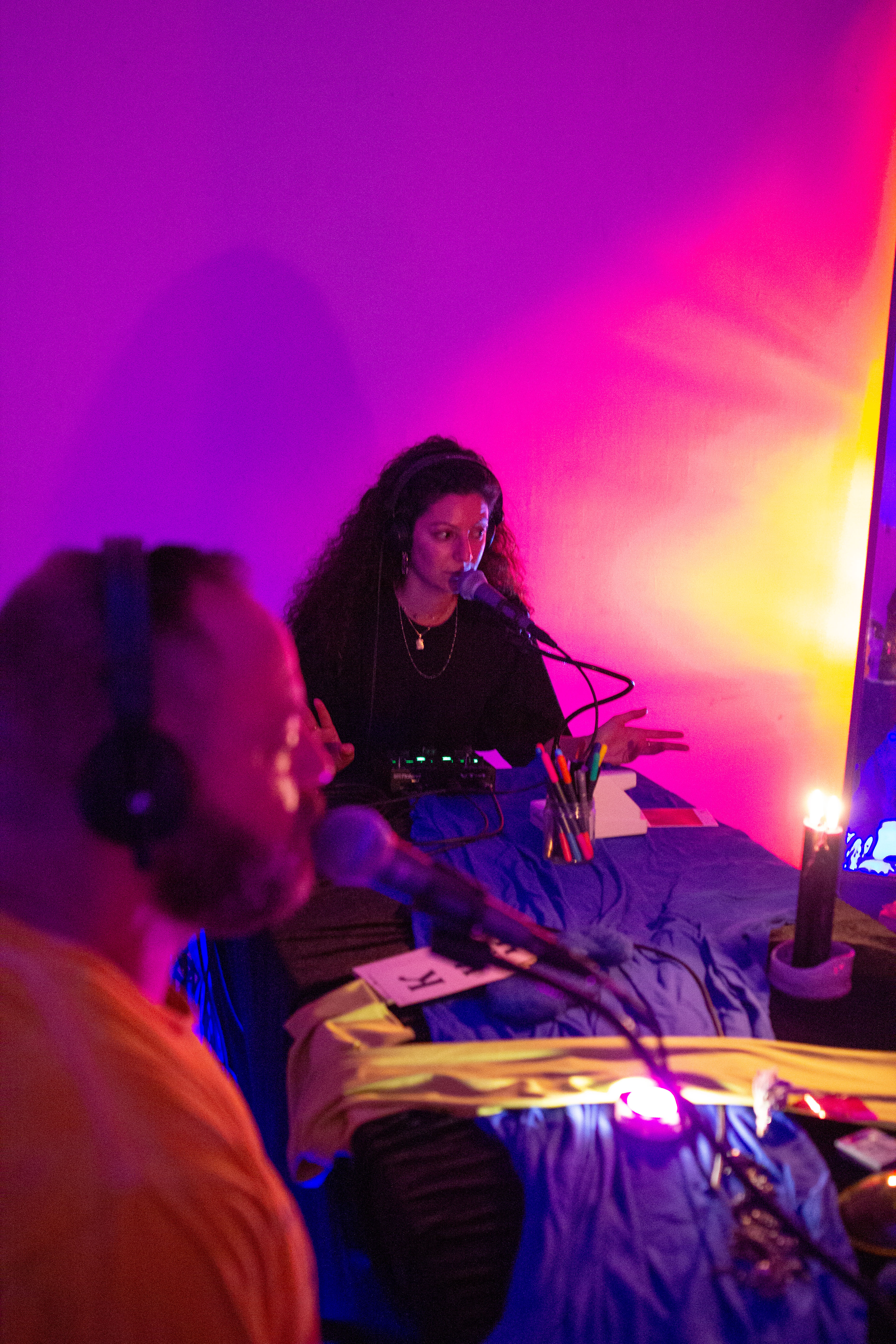 One-on-one guided conversational journeys coded in personal allegory, hooked up to a voice transformer in a projector-drenched & candle-lit half-glass space.